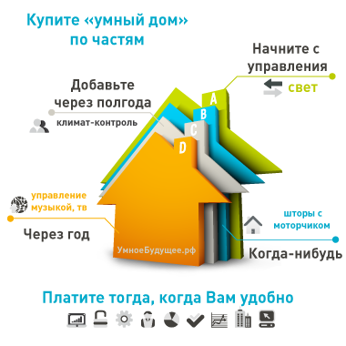 Мы предлагаем вам решение именно для вашего "умного дома", которое включает смету и описание того, что вы подключаете сейчас, а что можете подключить потом. Самый минимум-это проложить кабель для всей современной безопасной электрики. Всё!